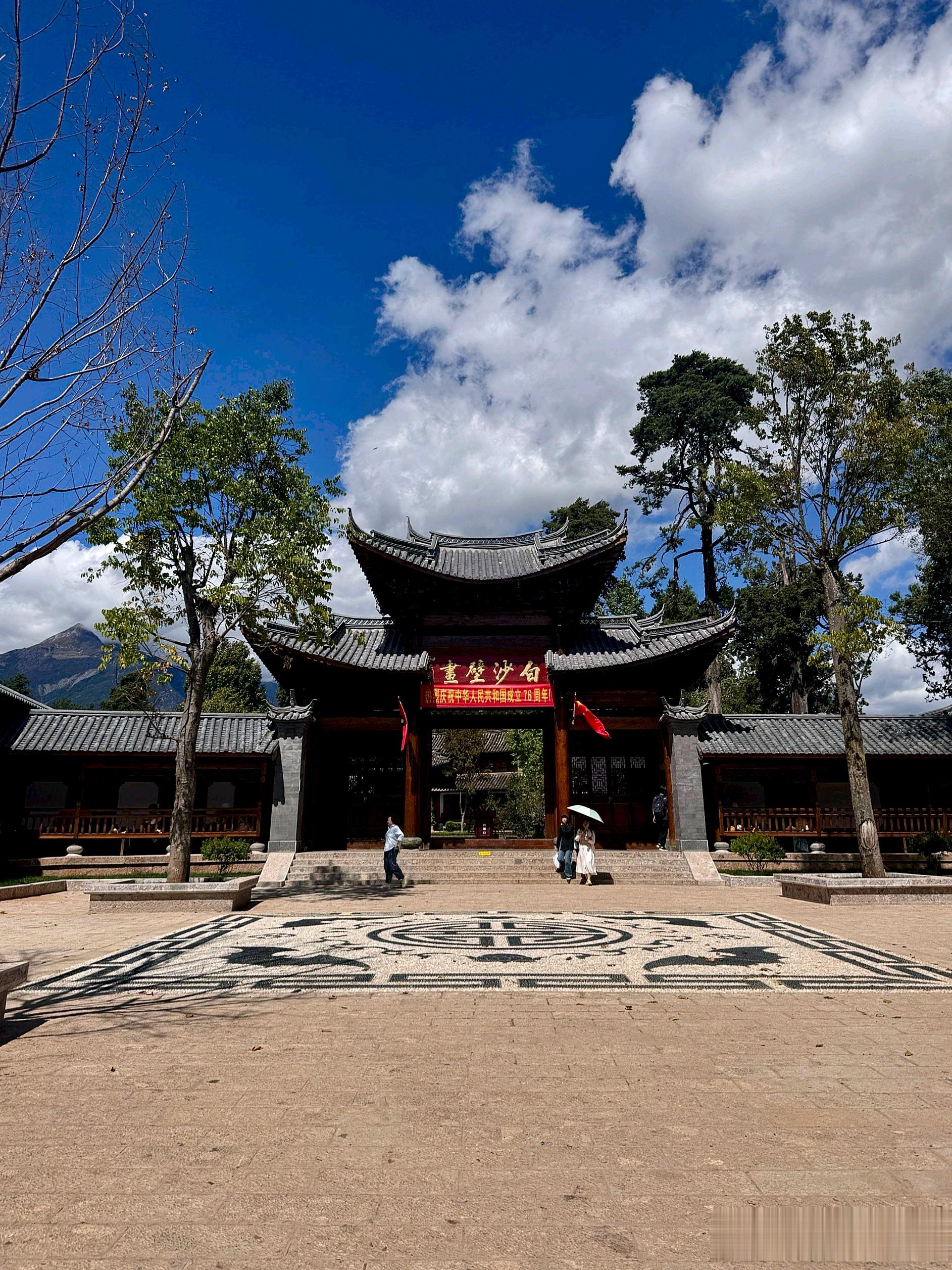 走到主街中间,会看到“四方听音广场”,这里是古镇的中心,有时候会有当地人跳民族舞,热闹又不嘈杂。从广场往东边拐,就能到“白沙壁画”,虽然不大,但能看到纳西族传统的绘画艺术,值得花20分钟看看。