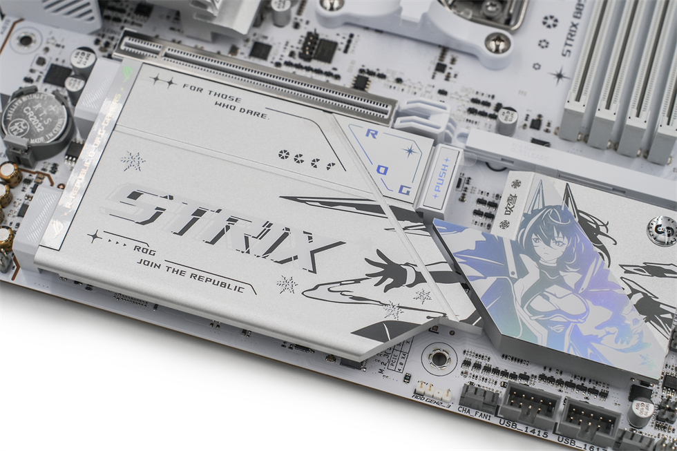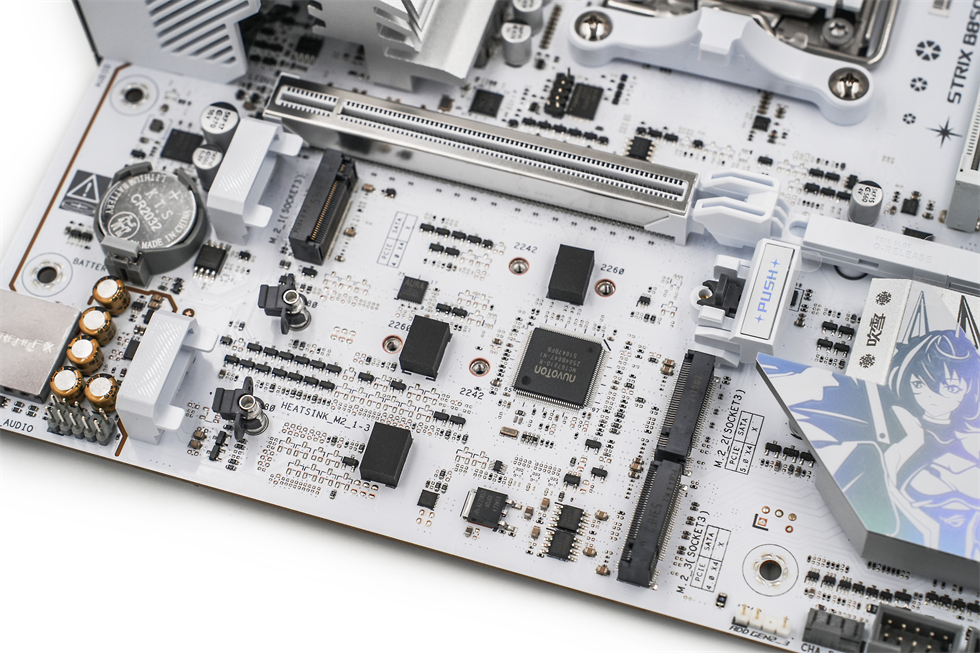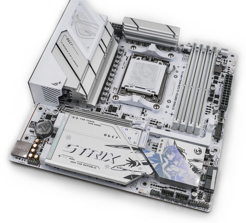 ROG STRIX B850-G GAMING WIFI S小吹雪顶部视角,能够看到采用了8+8pin的CPU供电。 四条纯白内存插槽支持双通道,最高支持256GB,8000MT/s,支持EXPO。