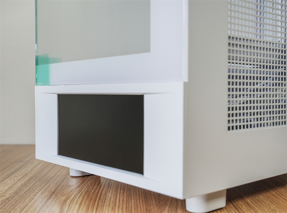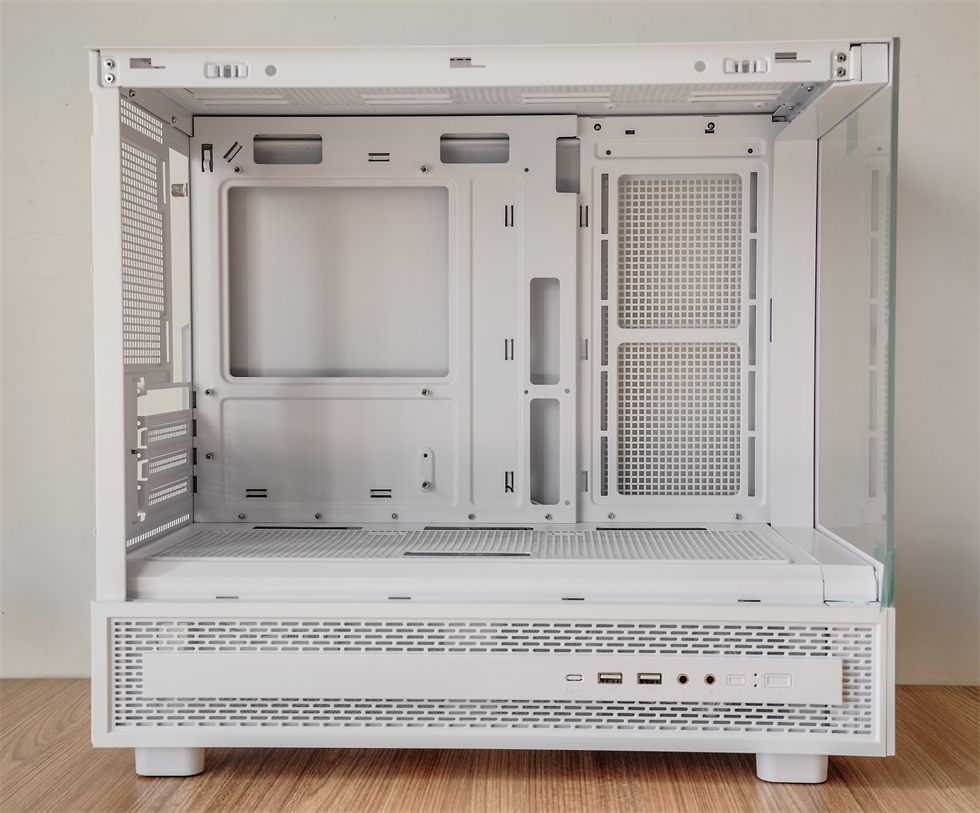 IO区在机箱侧面,由左至右依次为2×USB Type-A、音频输出接口、麦克风接口、重启按钮、电源开关。