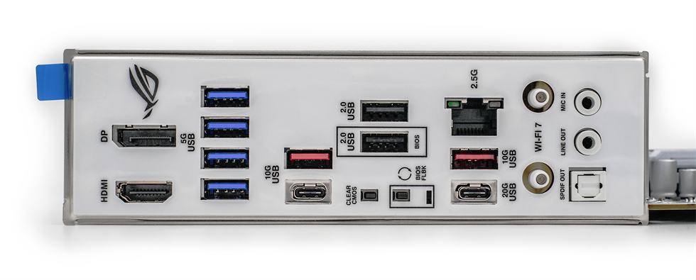 丰富的接口,从左往右依次为HDMI2.1和DP1.4视频接口、4*USB 5Gbps Type-A接口、1*USB 10Gbps Type-A接口、1*USB 10Gbps Type-C接口、2*USB 2.0 Type-A接口、1 x BIOS FlashBack按钮、1 x Clear CMOS按钮、2.5G网口、1*USB 10Gbps Type-A接口、1*USB 20Gbps Type-C接口、WiFi天线接口(Wi-Fi 7,新设计的快易拆天线插口安装更方便)、1*光纤S/PDIF数字音频输出接口、麦克风和耳机插孔。