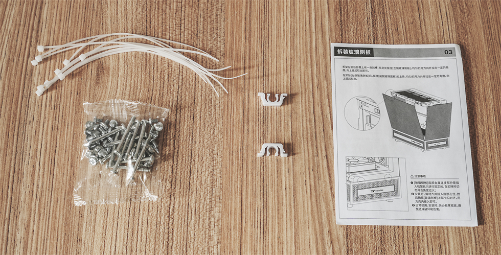 附件包括说明书、一袋各种安装螺丝、扎线带、挡板固定扣。