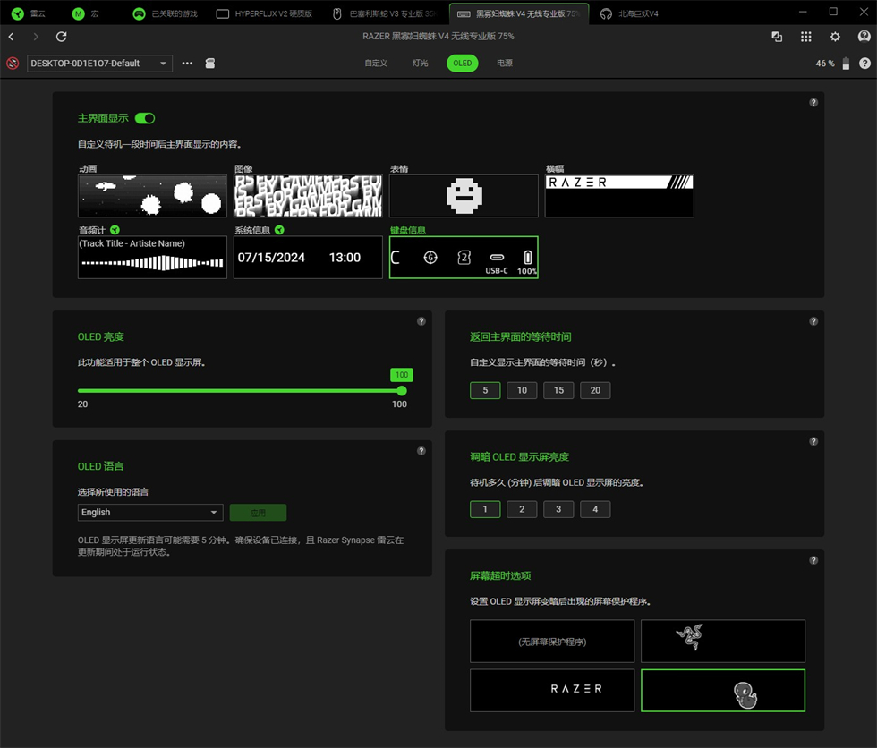 在雷云中可进行全键位编程+灯效自定义、还可以对OLED屏幕进行2.4G接收器指示灯、低电量告警、节能等相关功能设置。