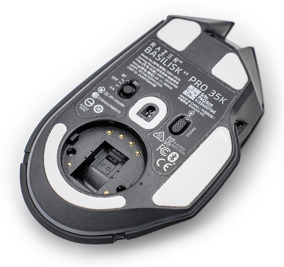 底部三模切换开关,有线/2.4G/蓝牙无缝切换,小圆扣可以直接替换无线充电模块,直接变身可无线充电的无线鼠标。