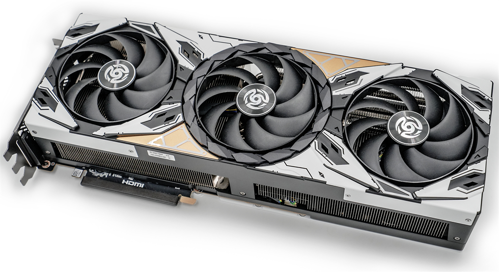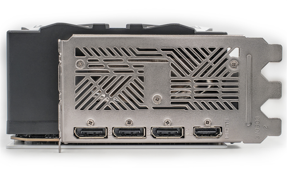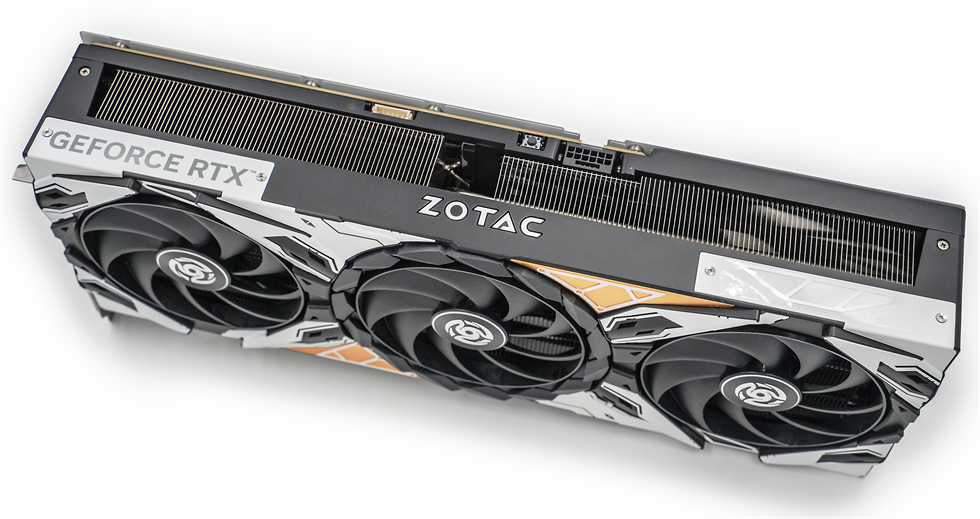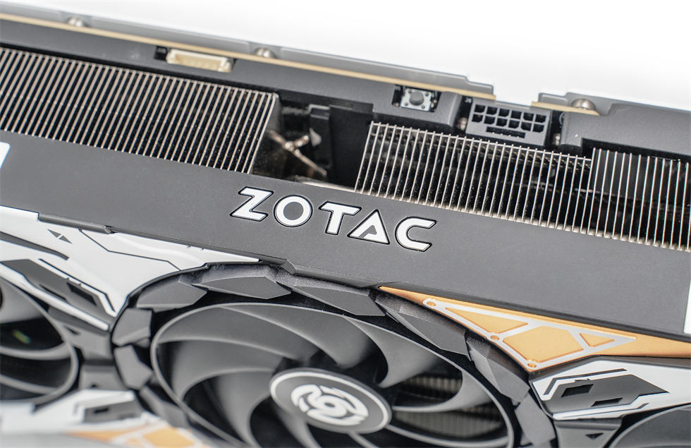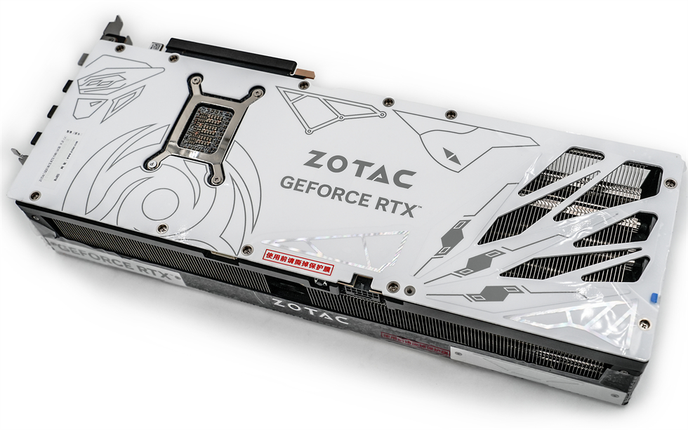 显卡背面覆盖合金背板已经是传统艺能了,背板底漆为白色,辅以“ZOTAC”的标志,颇为突出,右侧的大面积开孔构成了贯穿式风道,有利于空气穿透散热,进一步提升散热效能。