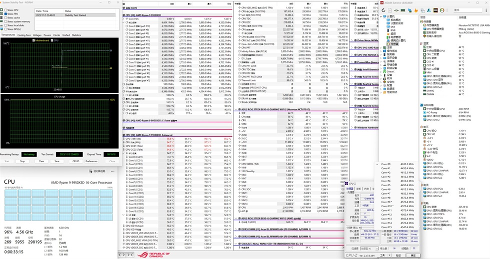 室温27℃,PBO拉满,单烤FPU,跑了10分钟温度稳定——CPU温度95.6℃、CPU核心96℃、CPU封装95℃,CPU功耗稳定在225W左右,CPU供电1.104V左右,频率全核4560MHz左右。