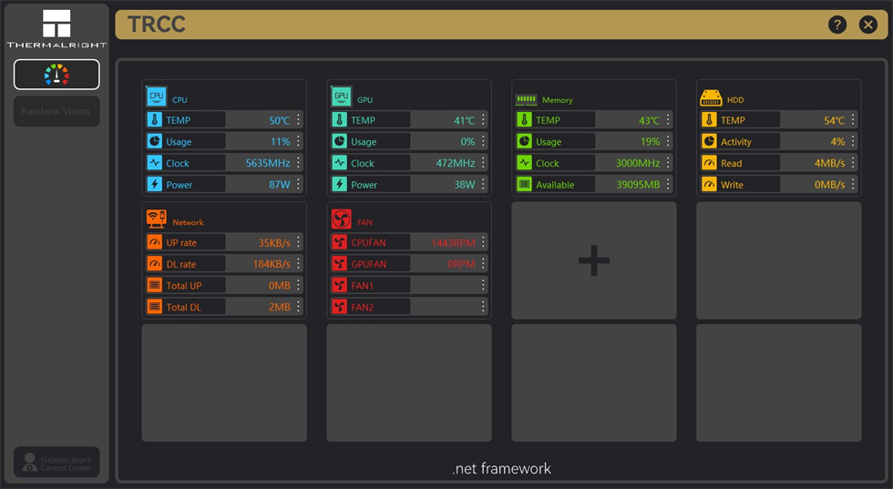 利民官方软件TRCC默认可以选择CPU、显卡、内存、硬盘、网络、风扇等6大项内容,二级子目录还有温度、占用率、频率、功耗等内容,根据喜好选择即可。