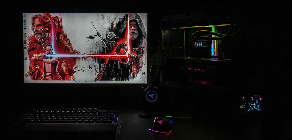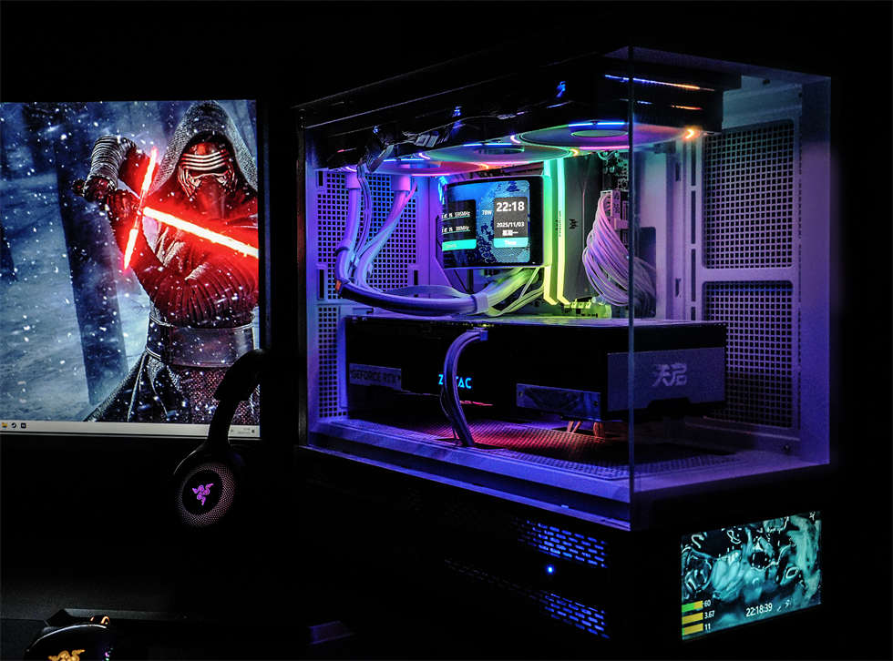 Tt钢影·透S-M Pro机箱和利民彩虹视界TURBO 360白色水冷组成的双屏幕主机无论哪个角度都有独特的显示效果。