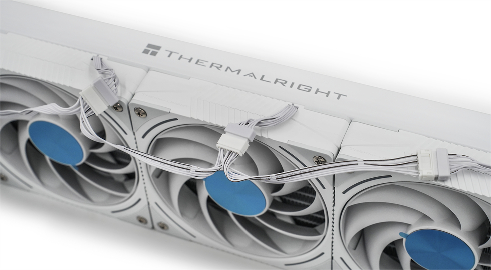 附带的风扇是TL-K12W-X28-R9 TURBO系列性能风扇,出厂已预装在冷排上,厚度28mm,采用9叶LCP扇叶,二次点胶动平衡,四角带有ARGB光带,3000RPM±10%转数,120.38CFM风量,噪音≤44.7dBA,通过5V/3pin ARGB接口连接风扇外圈灯效。