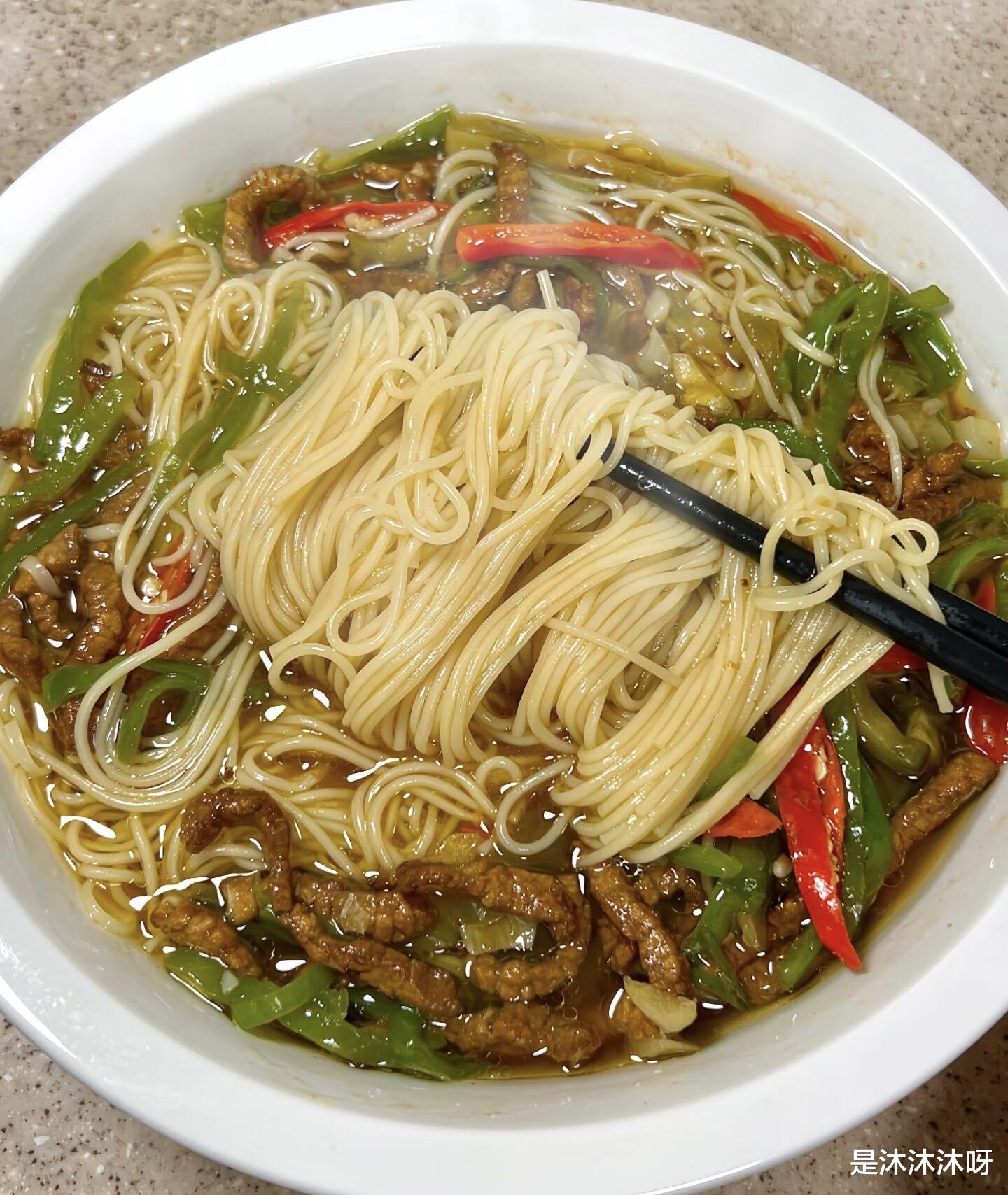 端起这碗热气腾腾的青椒榨菜肉丝面,先喝一口汤,咸鲜中带着青椒的清冽和榨菜的发酵风味,瞬间打开食欲;再吃一口面,面条筋道,裹着汤汁的鲜味,肉丝嫩滑、青椒脆嫩、榨菜咸香在嘴里交织;再把碗底的汤都喝干净,满足感从舌尖直冲天灵盖——这碗面,藏着最朴实的幸福,也治愈着每一个平凡的日子。