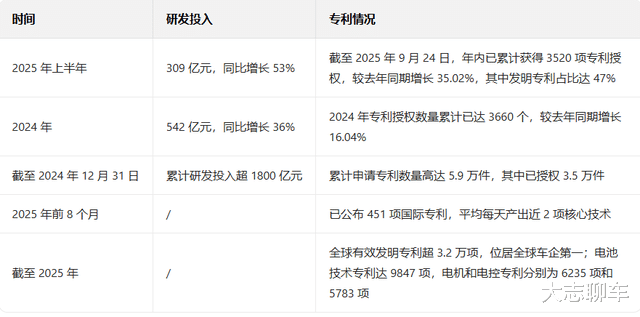 再然后,就是技术储备太多,没错,很多车企手里面攥着很多技术,只是还没有放出来,一些车企每年砸出去不少研发资金,动辄甚至达到上百亿的研发投入,你以为这些真金白银砸出去,是去烧钱的?海量的研发投入也给车企获得了不少的专利,以电车老大哥比亚迪为例,我整理了一份表格,你就能看出来比亚迪的投入有多狠了。