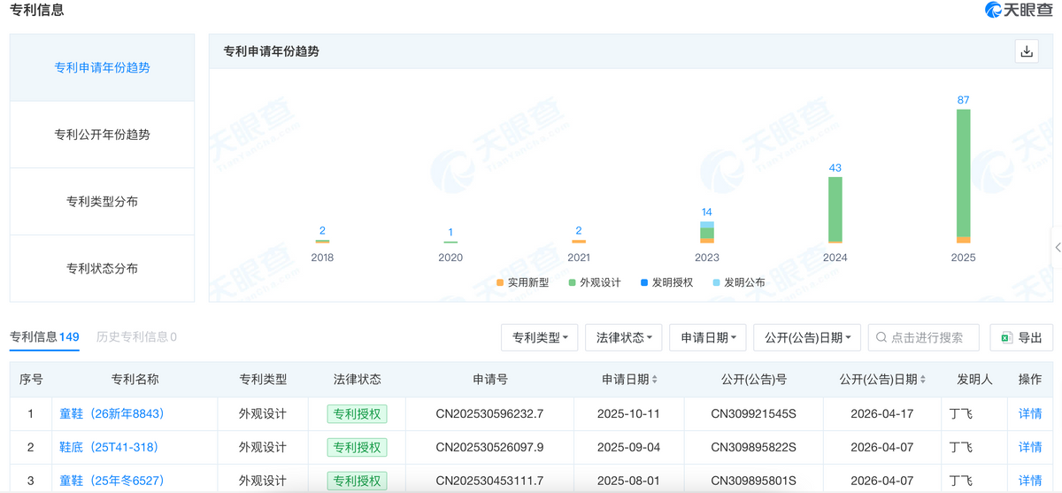 但尽管泰兰尼斯在营销中强调科技属性,其专利结构却引发了质疑。据天眼查数据,泰兰尼斯母公司拥有的148项专利中,约90%为外观设计专利,涉及鞋底科技、足部护足的核心发明专利寥寥无几,且部分发明专利已处于撤回状态。这意味着,泰兰尼斯的研发重心并非聚焦产品,缺乏具有实质技术含量的发明专利。