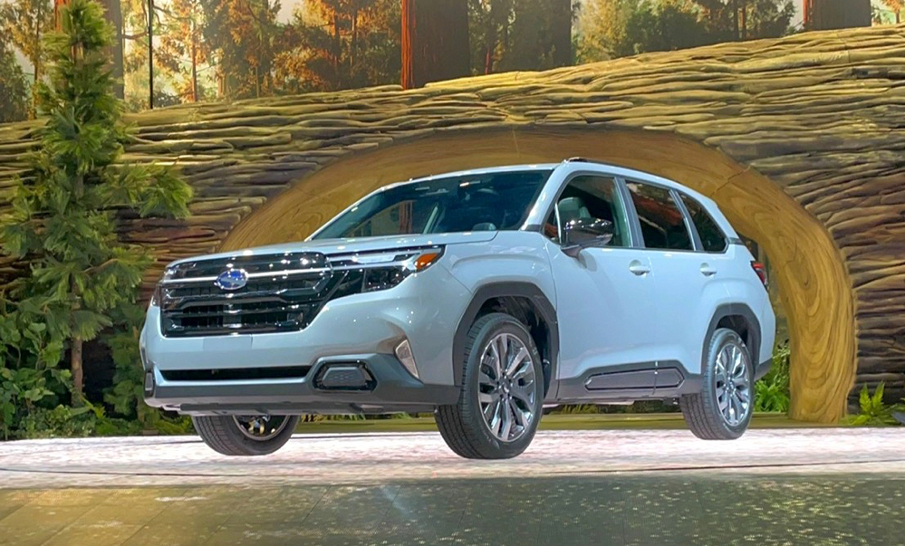 车前方面,全新大改款 斯巴鲁森林人(Subaru Forester),采用全新的设计语汇,换上大面积的六角形水箱护罩,与新的 LED 头灯组连接一起,营造出相当霸气的前脸设计。同时新车周围具备防刮材质,强化粗犷气息。
