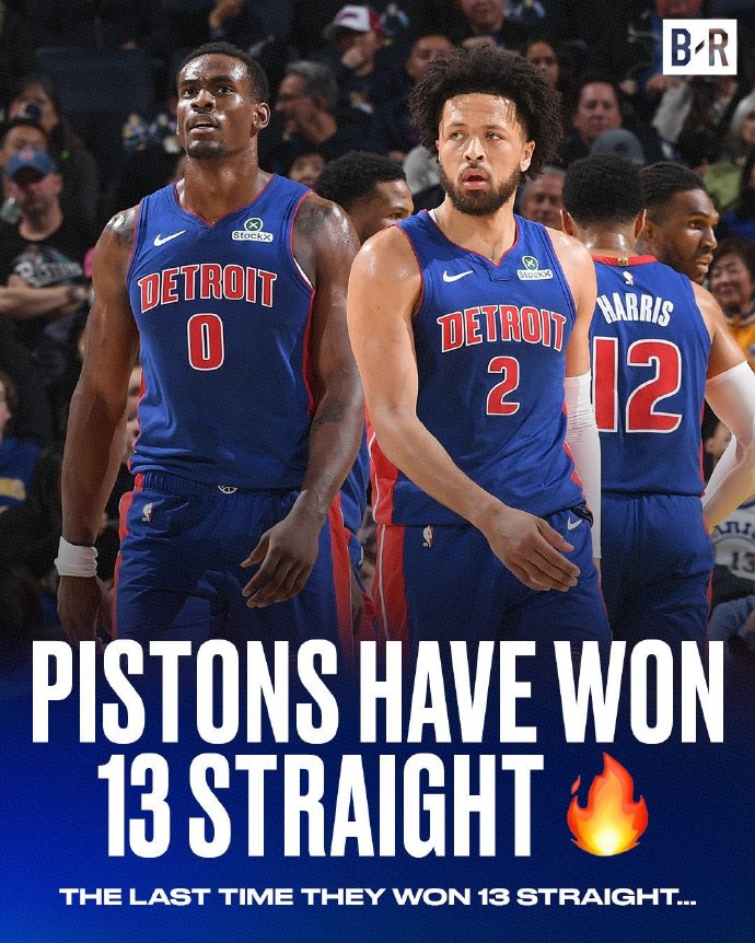 活塞今天在在客场以122-117击败步行者,豪取13连胜,追平了队史最长连胜纪录。活塞之前分别在89-90赛季和03-04赛季取得过13连胜,而这两个赛季他们最终都拿到了总冠军。活塞目前也以15胜2负的战绩位列东部第一,只要保持下去确实有夺冠的实力。