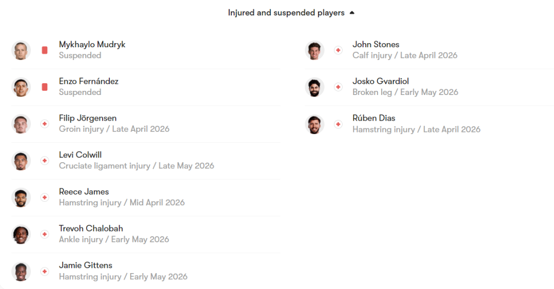 切尔西正遭遇赛季最严重的伤病危机:科尔威尔、查洛巴、詹姆斯等大主力伤缺,中场核心恩佐被队内禁赛,导致球队攻防体系近乎崩塌。进攻端依赖佩德罗的个人能力,缺乏恩佐的组织串联,场均进球数从1.71球跌至1.53球;防守端,弗法纳+哈托的中卫组合经验不足,面对曼城高位压迫和长传调度,很可能出现站位失误,而凯塞多的单后腰扫荡能力难以覆盖全场。