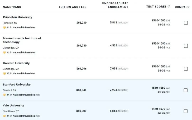普林斯顿、MIT、哈佛依旧稳坐前三甲,展现了其不可撼动的综合实力;