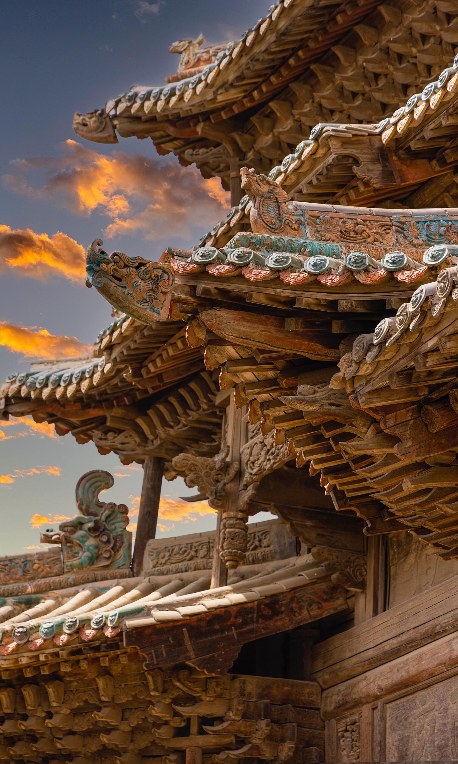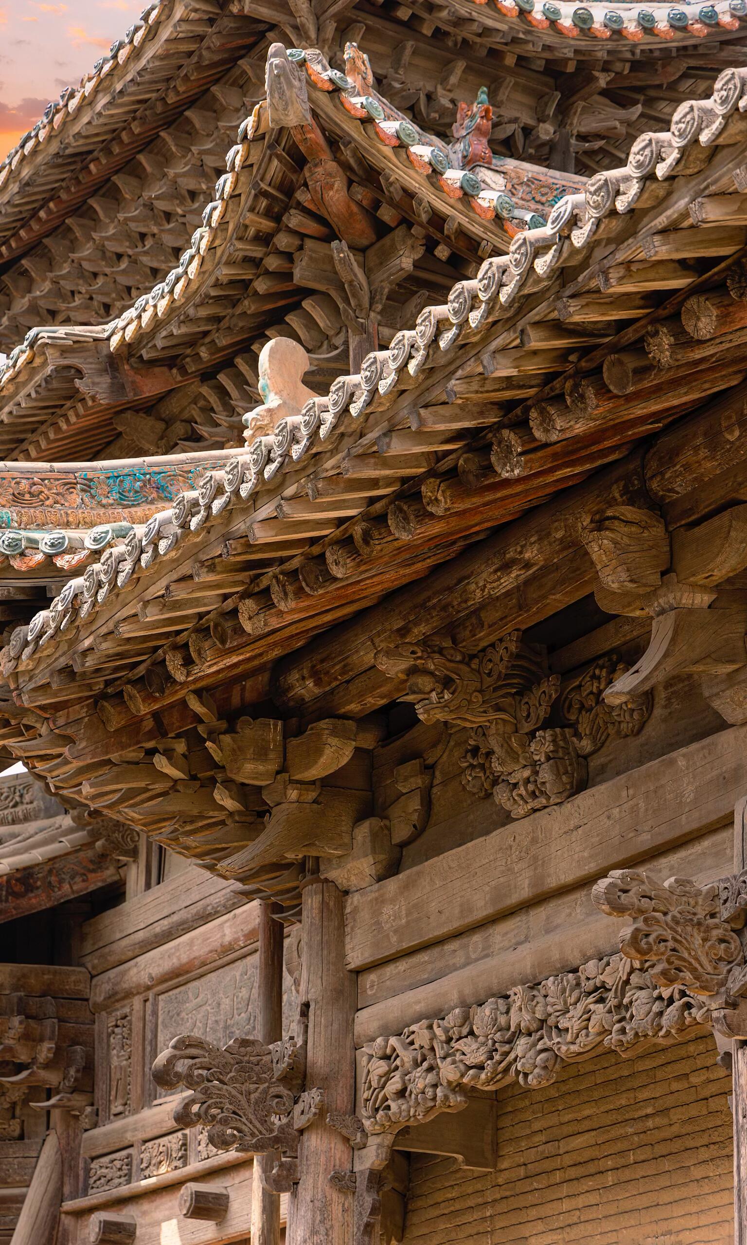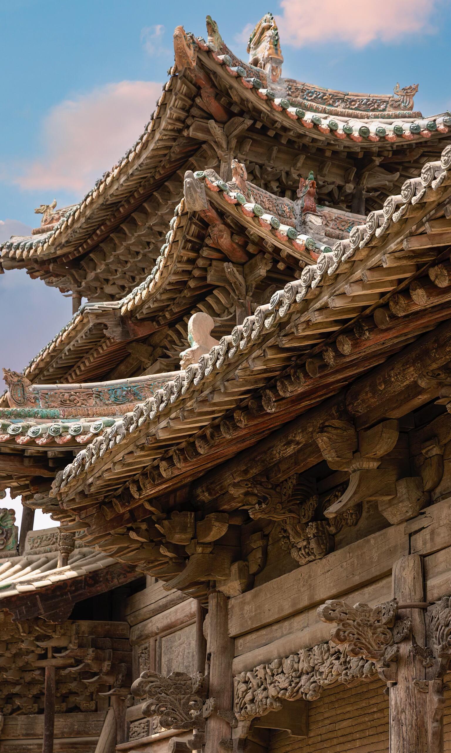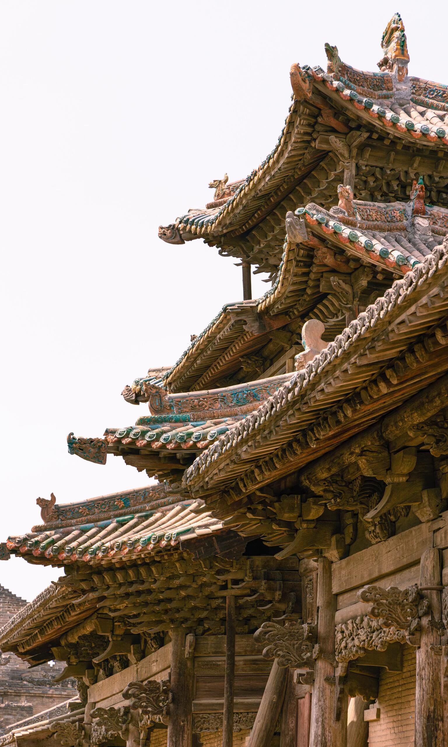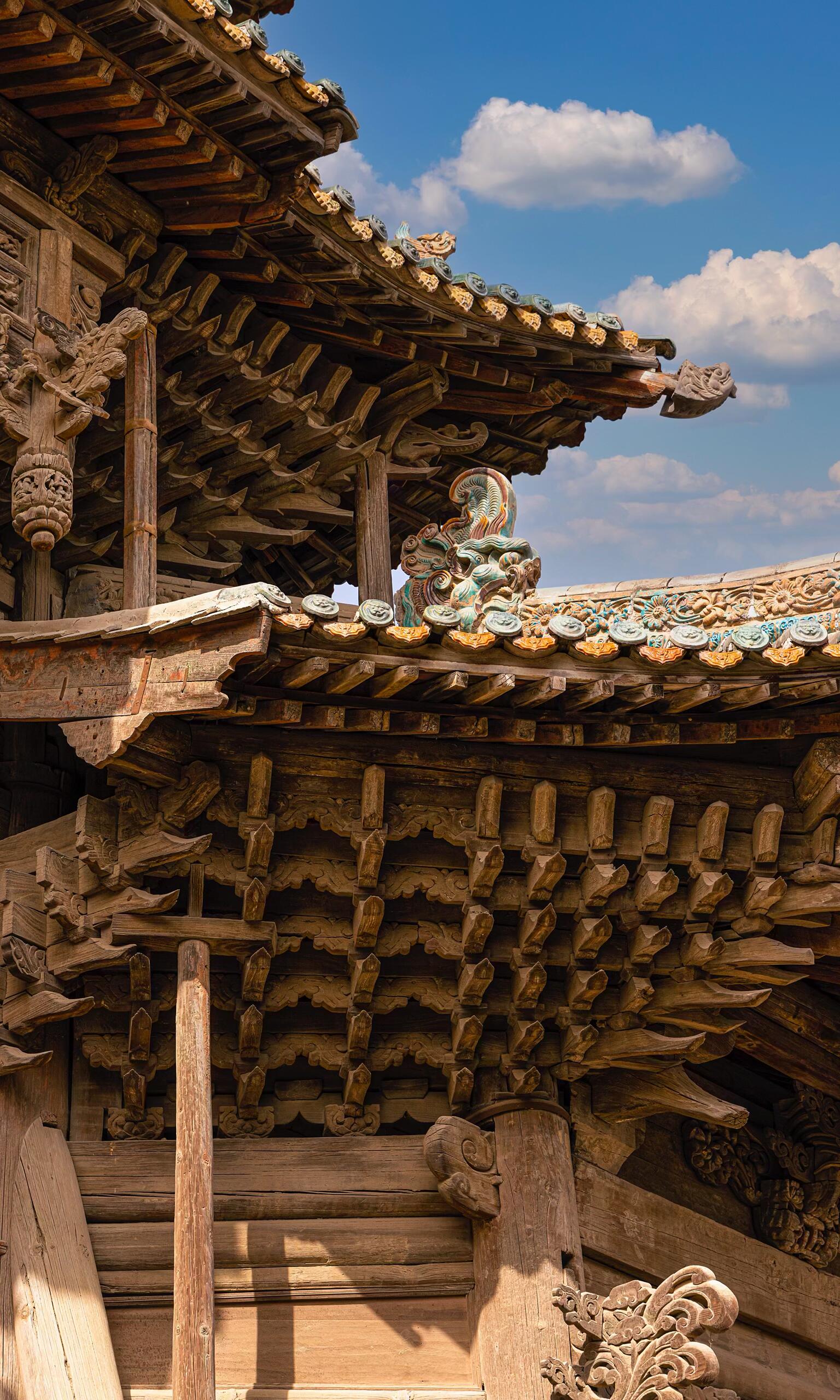 走近山门,才发现它远比远观时更为精致。每一朵斗拱都层叠有序,密密麻麻却又井然有序,犹如古木枝头绽放的莲花,层层叠叠,尽显巧思。斗拱之间,昂嘴微微翘起,线条流畅而有力,梁头的卷草纹雕刻细腻,藤蔓缠绕,栩栩如生,仿佛下一秒便会顺着木梁蔓延生长。柱础上的雕刻更是精妙,繁复的花纹中藏着吉祥的寓意,虽历经岁月打磨,却依旧能看清每一处细节的棱角,让人不由得惊叹明代工匠的匠心与技艺。最令人称奇的是屋顶的琉璃装饰,那只鱼化龙造型的琉璃构件,鳞爪飞扬,神态威猛,釉色莹润鲜亮,在阳光下折射出璀璨的光芒,仿佛真的要挣脱屋顶的束缚,腾云驾雾而去。