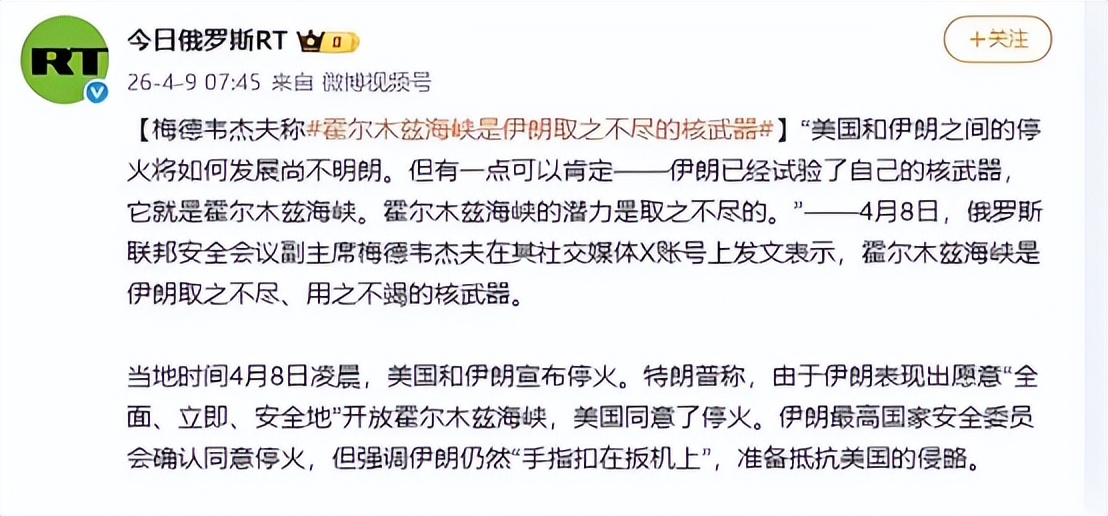 4月8日,梅德韦杰夫在社交媒体上公开表示,伊对核武的掌握已经到了最后关头,他们已经秘密完成了核试验,并将其命名为“霍尔木兹海峡”。