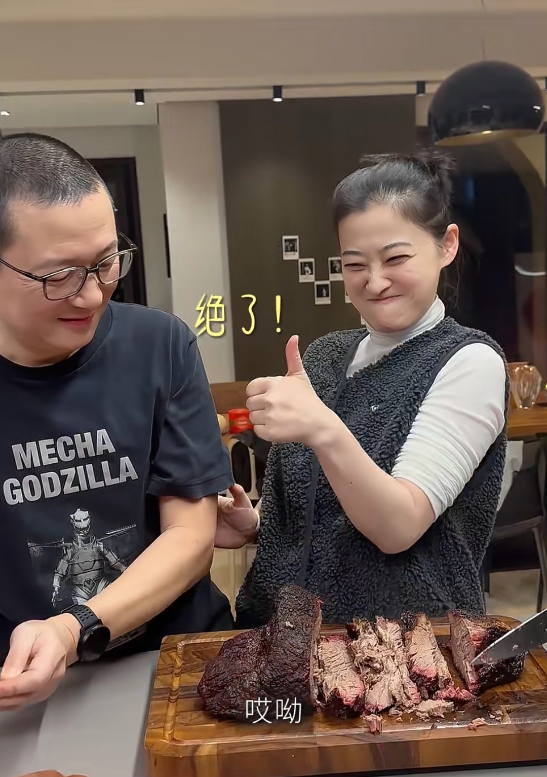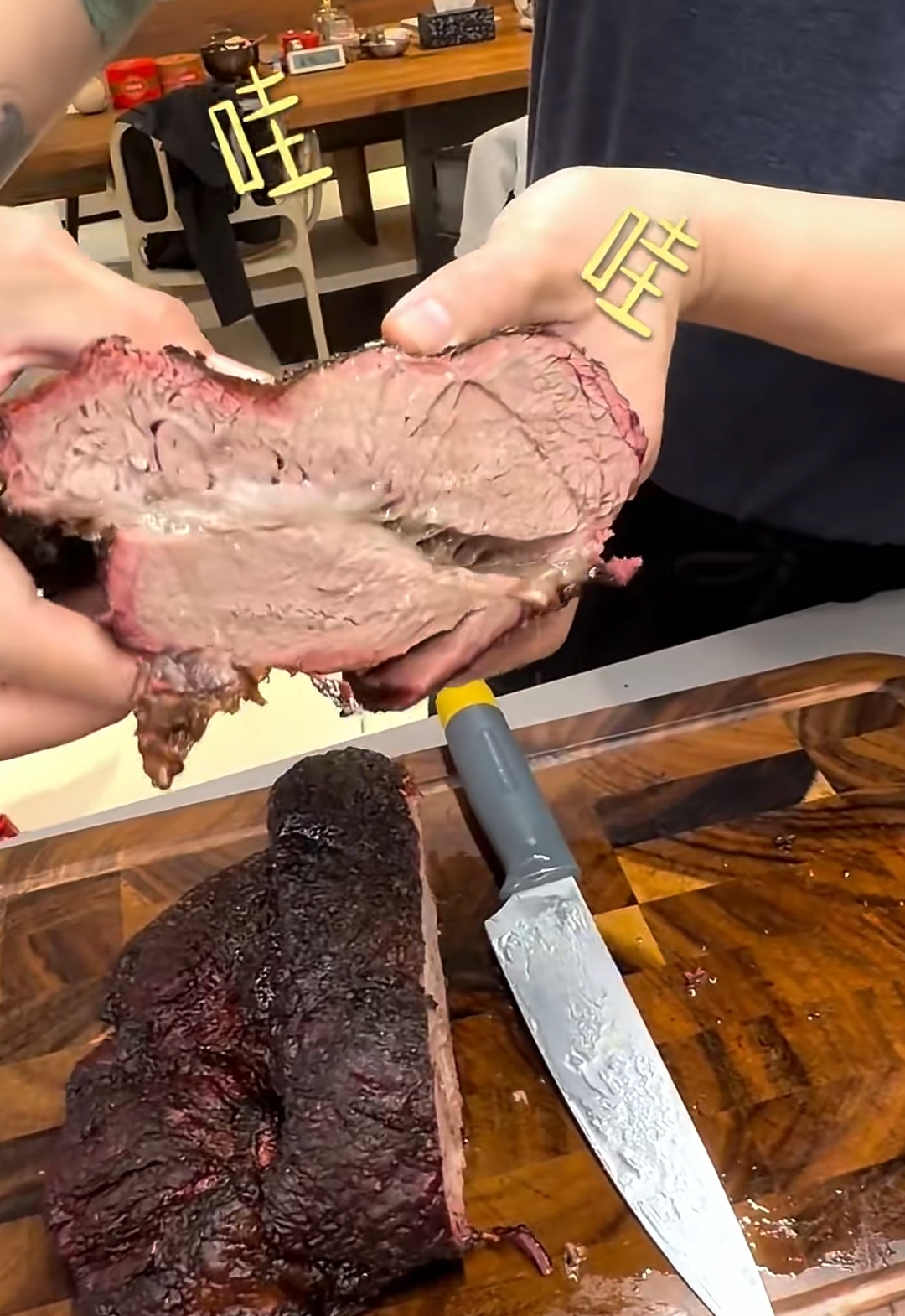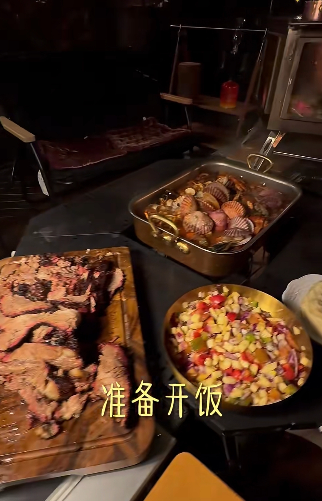 为了拿出主人家的重视,梅婷的老公在宴客的前一晚上就开始准备菜品了,腌了一大块牛肉,然后一大早又开始烤肉,烤得外焦里嫩,看着就很有食欲。