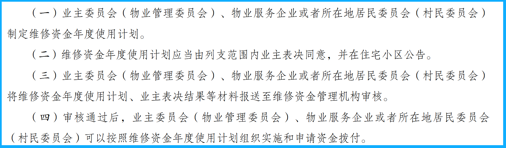 业主委员会(物业管理委员会)、物业服务企业或者所在地居民委员会(村民委员会)可以按年度申请使用维修资金,按年度申请使用维修资金的,按照下列程序办理: