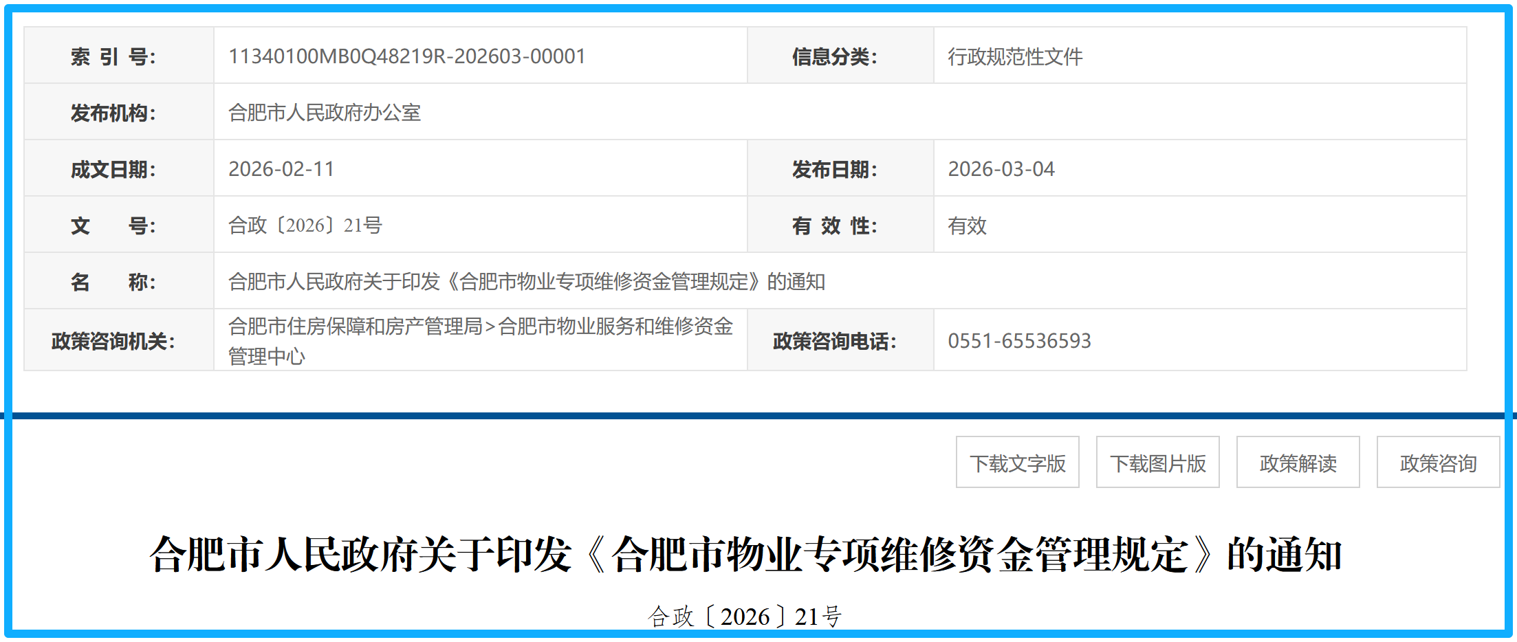 2026年3月4日,合肥正式发布《合肥市物业专项维修资金管理规定》,自2026年4月1日起施行,有效期三年。《合肥市物业专项维修资金管理暂行规定》(合政〔2017〕161号)同时废止。