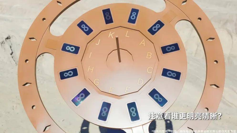 第二轮比拼实验,则是模拟高光画面显示,就在正午阳光最强达到14万lux顶峰的时刻,所有手机统一显示黑色背景上的白色无限符号,这也是这一代华为Mate 80系列的标志性设计语言,华为Mate 80 Pro Max依然是所有手机中更明亮、通透,以更高对比度脱颖而出。