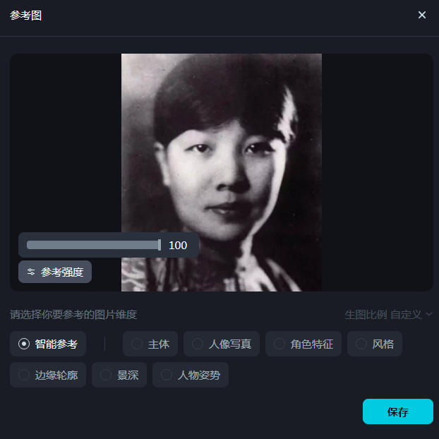 (1)打开即梦网站,导入参考图,选择默认的智能参考,参考强度设置为100,点击保存。