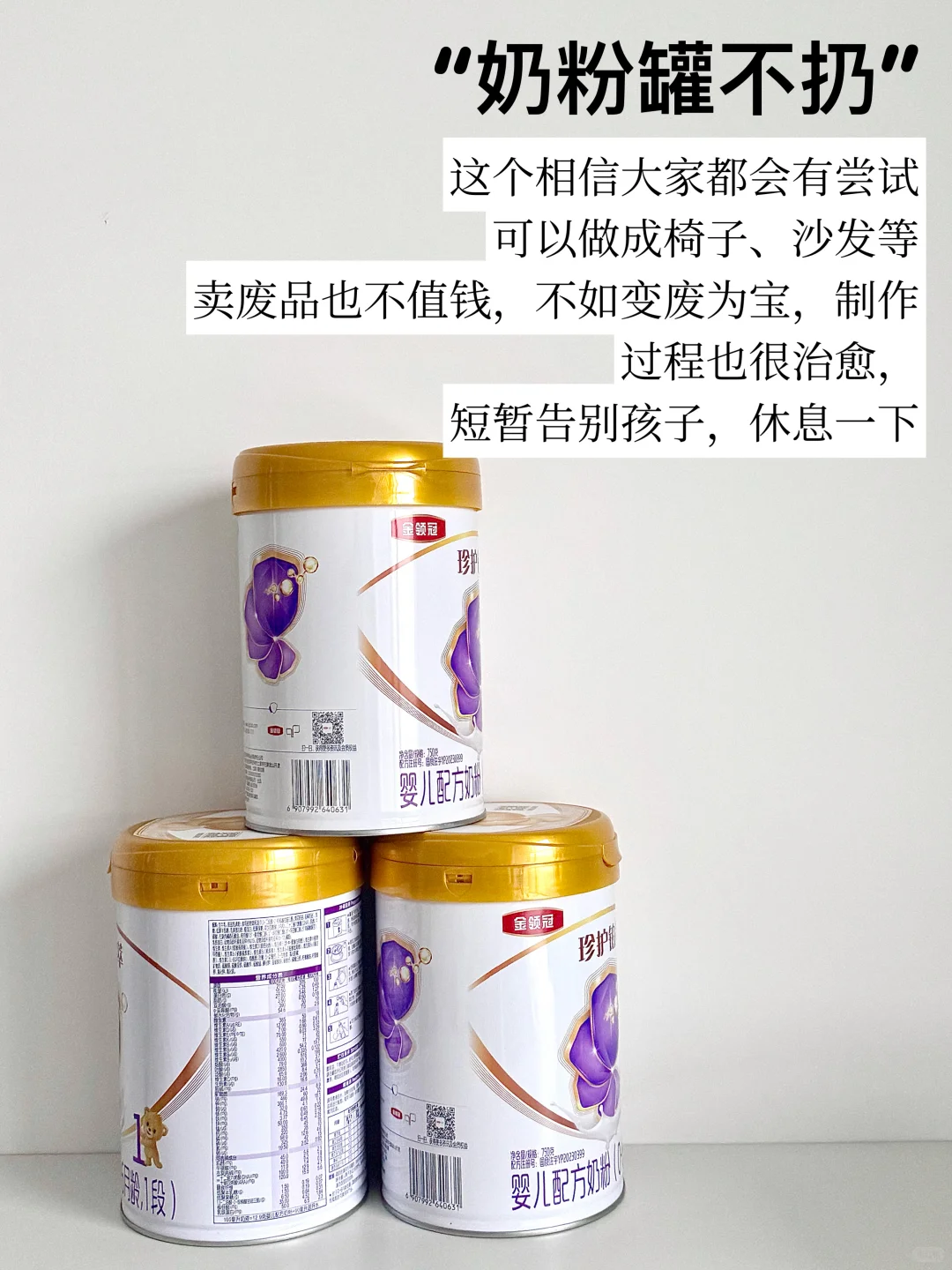 这些奶粉罐卖废品的话也换不了几块钱,还不如动动手将其变废为宝,这样也不需要再花钱去购买什么宝宝沙发或者是爬爬梯了。