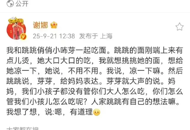甚至谢娜讲述他们家的“张氏三姐妹”不同的性格,谈论老大跳跳喜欢讲话和讲故事,老二喜欢唱歌,甚至出去散步都会自己一路上编歌,遗传了爸爸的唱歌天赋,老三是个社牛出去看到人都要社交一下。