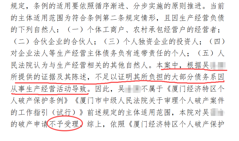 笔者梳理发现,许多申请人在经过法院的初步审查或咨询辅导后,才发现自己的债务性质与法律要求存在偏差。例如,在2025年厦门法院立案审查的一宗案件中,申请人吴先生虽有创业背景,但其负债起点源于早期的房贷、车贷,因无法证明负债主要用于公司生产经营,最终法院认为其不符合申请条件。