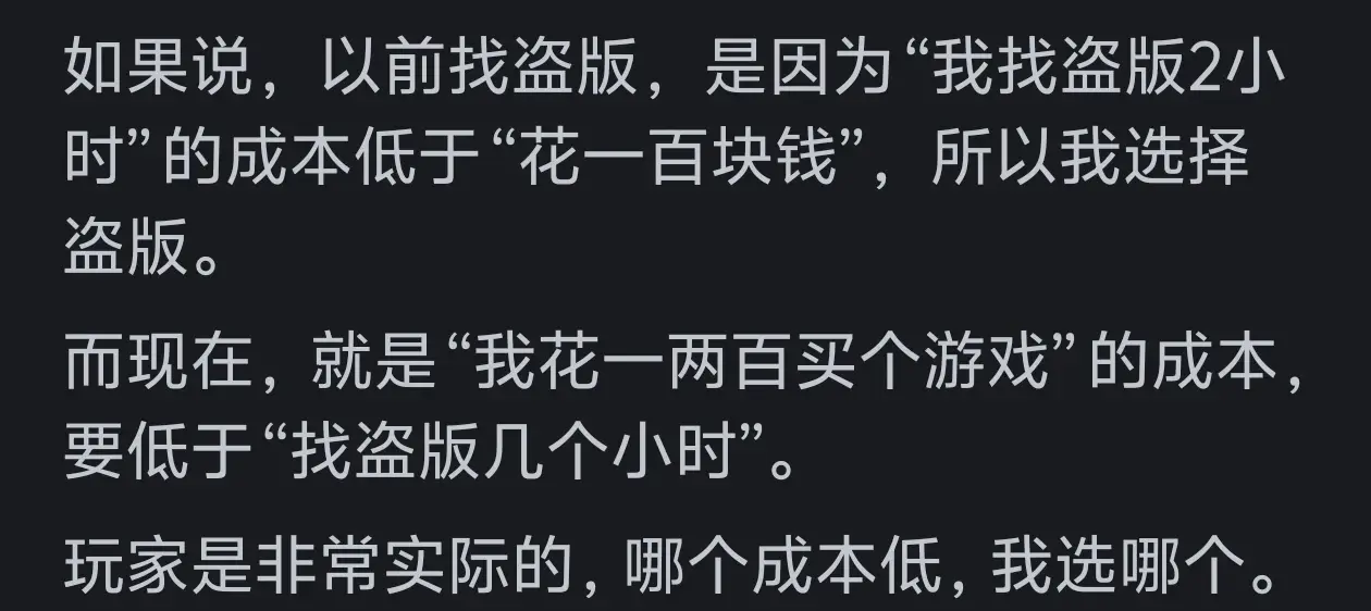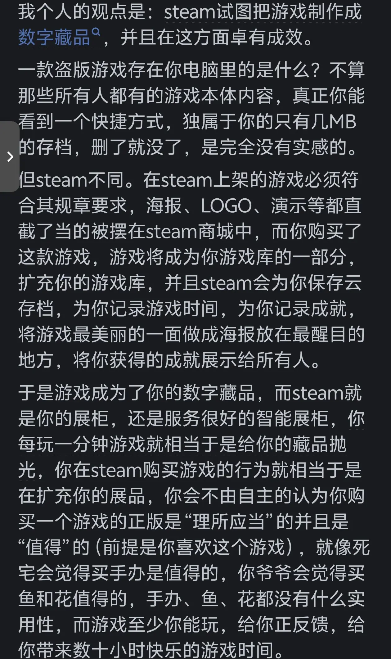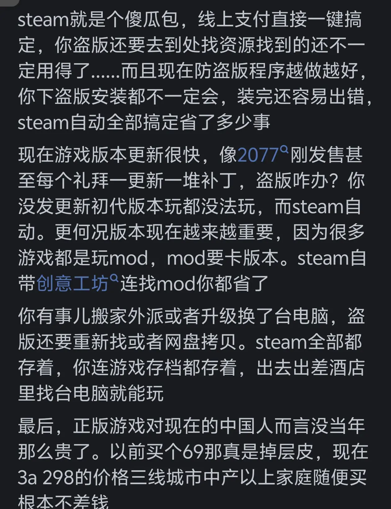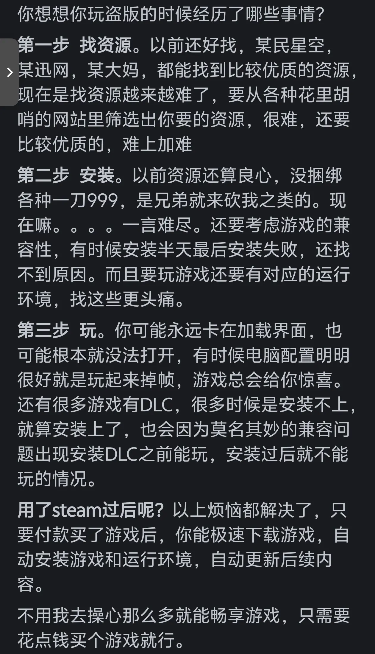steam正版也就那点钱,省了那么多麻烦,还有mod,那么多mod又免费,体验太好了。好游戏那么多,正儿八经买一个都能玩很久。经常打折活动,看到折扣大,都会去囤游戏,最后库里一堆游戏还从没玩过
