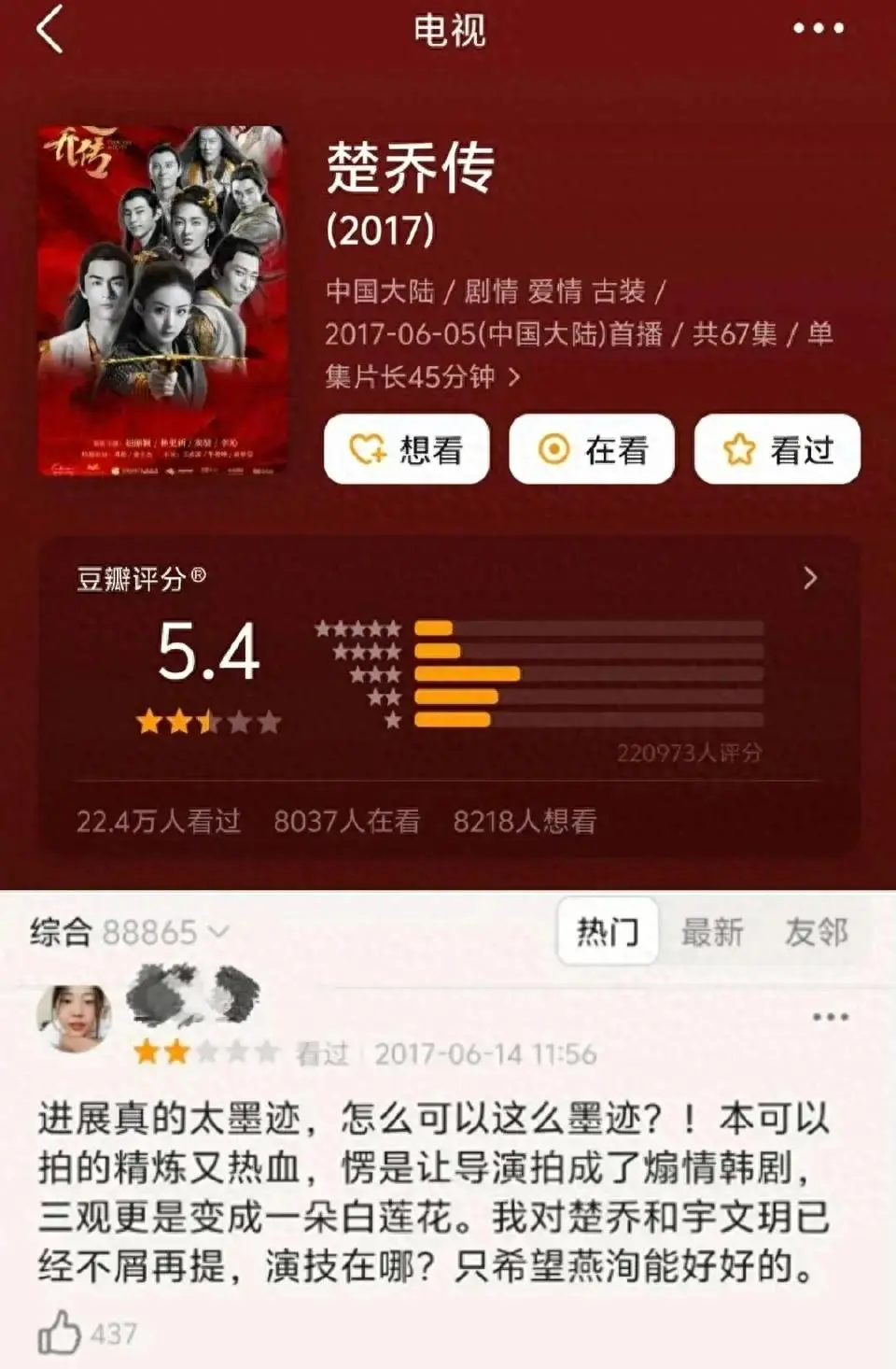 令人意外的是,这部续作的拉胯,竟意外带火了当年被22万人打分仅5.4分的原版《楚乔传》。