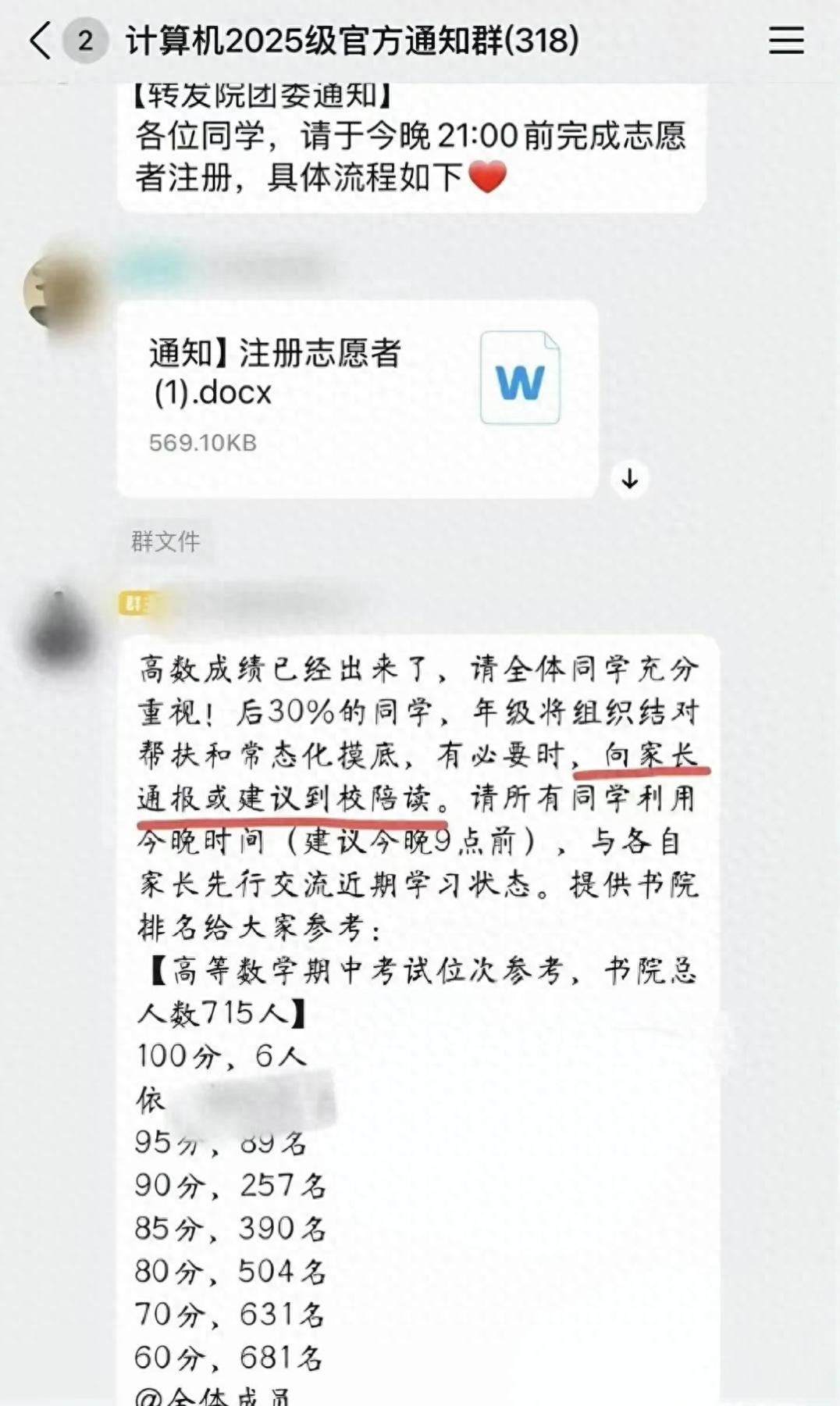 近日,有网友发文称,南京理工大学致知书院计算机2025级官方群内发布一则通知,其中提到:高数成绩现已公布,排名后30%的同学,年级将组织结对帮扶与常态化摸底,“必要时会向家长通报,或建议到校陪读”。通知还附有高数期中考试成绩位次参考,并提醒所有同学与家长提前沟通近期学习状态。