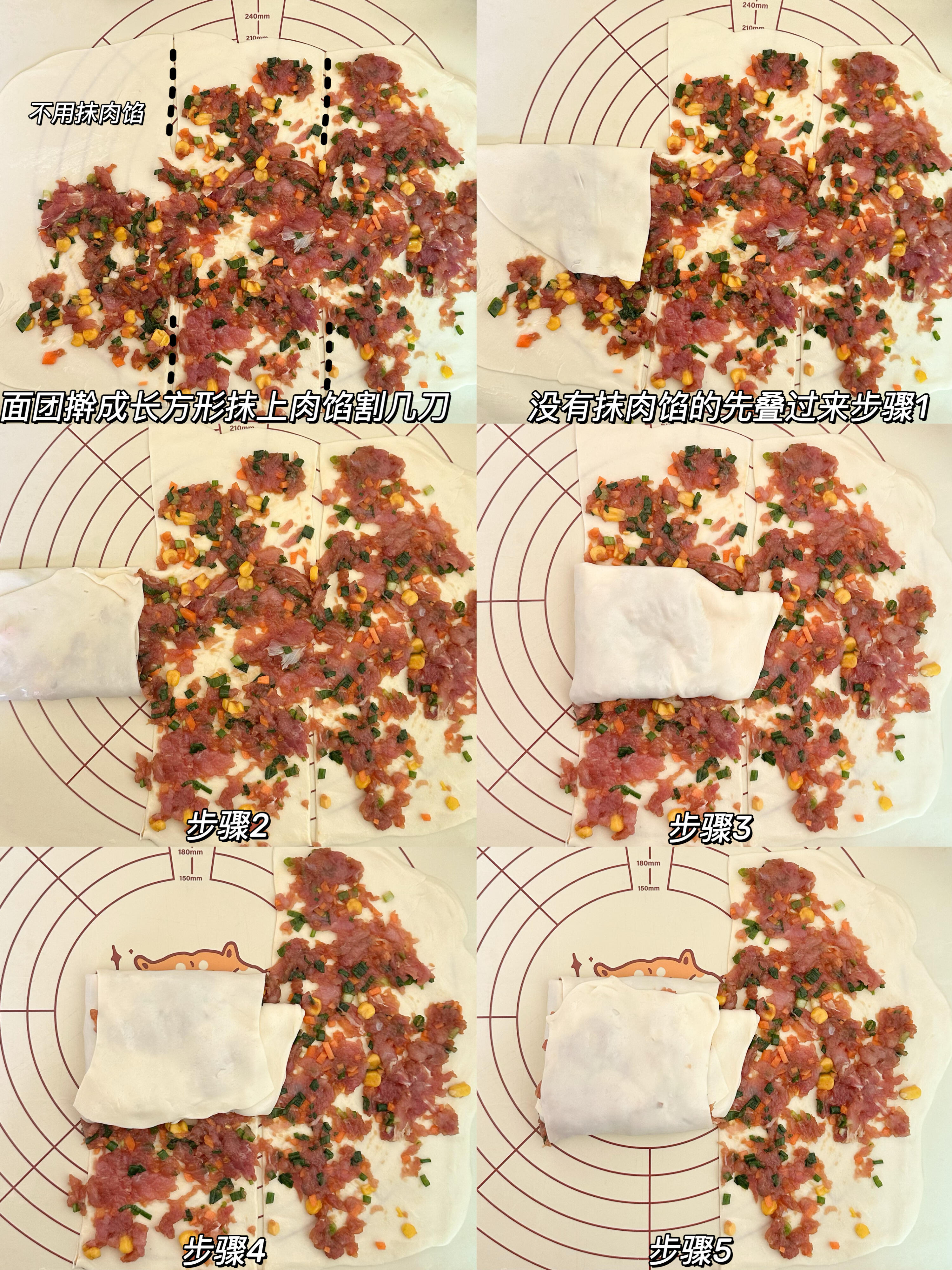 • 按照步骤图的指示,将面片一层层折叠起来,最后收口捏紧。