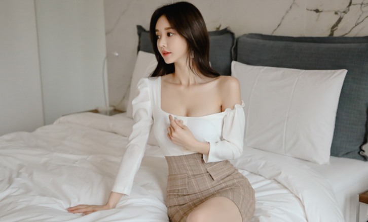 她穿着性感的小白裙和黑丝,上半身溅湿了不少,裙子的面料紧贴着她的身体,惹人遐想。