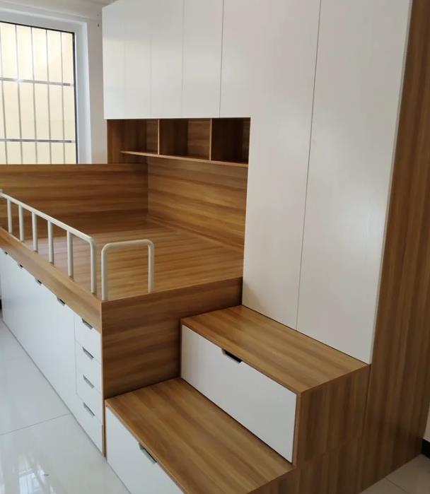 大家可别小瞧这种半高床的台阶,为了增加家里的收纳空间,专门把每一个台阶都设计成了抽屉。