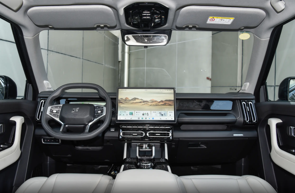 如果说在性能和越野功能上,这台2025款捷途山海T1给人的感觉就像是一个“肌肉虬结”的汉子,那么在内饰的设计语言上,它就表现出了其温柔的一面。在前排方面,2025款捷途山海T1配备了10.25英寸的全液晶仪表,同时中控屏幕的尺寸也是达到了15.6英寸,所以会有较强的科技感在其中,并且在中控屏幕的内部,2025款捷途山海T1也是配备了高通8155车规级芯片,在屏幕的流畅程度上也是有所保障的。其次,2025款捷途山海T1的空调出风口也是采用了立体风格的设计,再加上电子怀挡和旋钮切换驾驶模式的细节设计,也体现出该车不凡的一面。至于功能配置上,2025款捷途山海T1则支持当下主流的HUAWEI HiCar和苹果Car Play手机互联映射功能,在用车的趣味性上还是有所保障的。