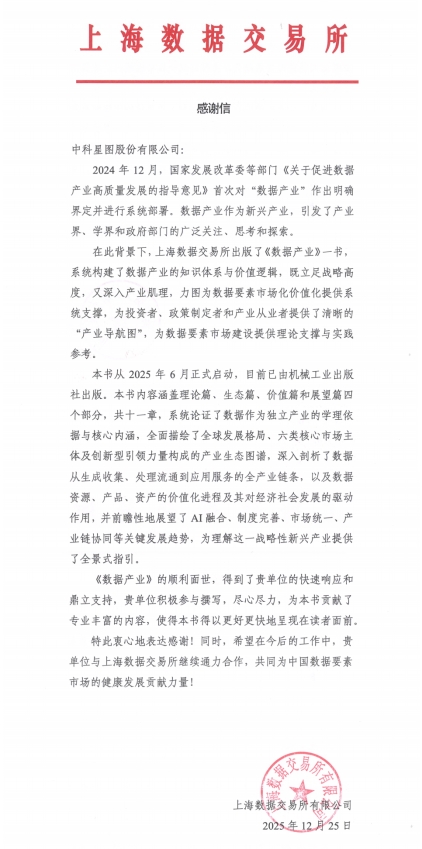 这些数据产品凭借精准化、标准化的特性,为低空飞行安全、航线规划、城市管理等场景提供核心数据支撑,丰富了上海数据交易所低空数据产品供给,也为数据要素在低空经济领域“供得出、流得动、用得好”提供了实践范本,进一步夯实了公司在数据产业与低空经济赛道的核心竞争力,助力构建良性循环的数商生态。此次入选《数据产业》专著并获上海数据交易所致信感谢,既是对中科星图过往发展成果的认可,更是对公司未来在数据产业领域持续创新的期许。作为数据资源企业的代表性力量,中科星图将继续深化在线数字地球技术创新与产品应用,拓展数据应用场景与服务领域,携手生态合作伙伴,在数据要素市场化价值化进程中发挥更大作用,为中国数据产业高质量发展注入持久动力。