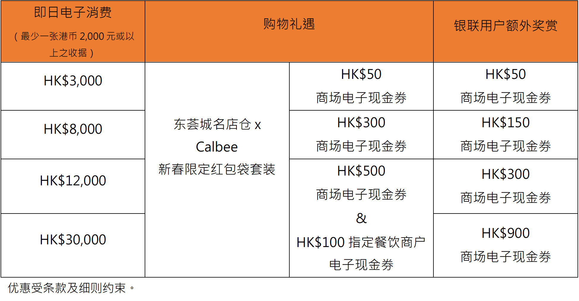 由即日起至2026年2月19日,CLUB CG会员于场内消费满指定金额,即可换领以下丰富购物礼遇;银联用户使用银联卡、银联手机Pay或银联二维码消费更可获额外奖赏,获得高达总值HK$2,350无消费门坎的商场电子现金券!