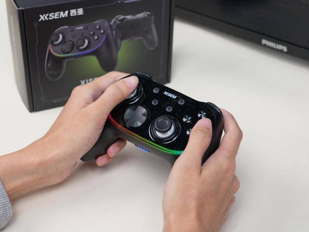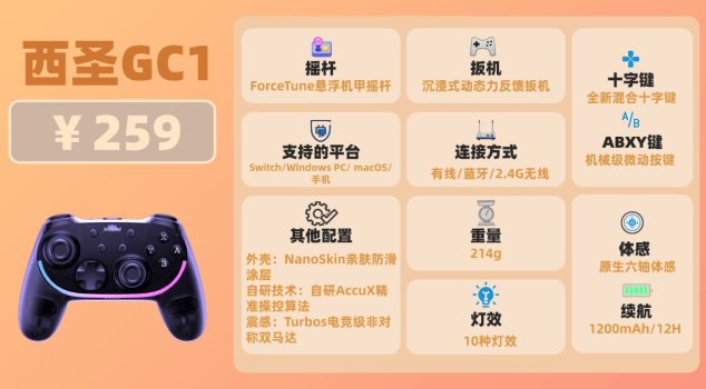 功能上,西圣GC1同样表现出色。电竞级0.5ms极速连接引擎搭配2.4G/蓝牙/Type-C三模,让操作延迟极低、输入响应精准,“所想即所控”;原生六轴体感系统可捕捉旋转、倾斜、挥动等细微动作,射击瞄准和赛车漂移都更稳更准;214g轻量化机身、15°人体工学握角及NanoSkin亲肤防滑涂层带来长时间握持也舒适稳固的体验;半透明幻雾晶透机身配合10种RGB灯效模式,科技感十足;同时支持全平台兼容,一机畅玩手机、PC、Switch等设备。整体配置堆料扎实、体验全面,是百元价位中少有的闭眼入手级电竞手柄。