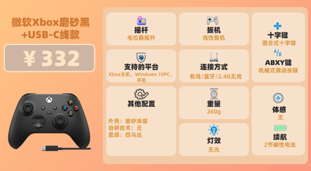 排名九:微 软X box磨砂黑+USB-C线款游戏手柄
