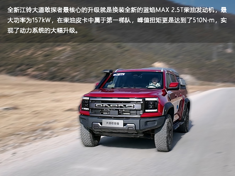 对于柴油皮卡来说,动力储备至关重要,这是因为无论极限脱困、爬陡坡等高强度越野场景,还是重装穿越作为保障车装载诸多备用物资,都非常考验一台皮卡的动力性能。为此全新江铃大道敢探者最核心的升级就是换装全新的蓝焰MAX 2.5T柴油发动机,最大功率为157kW,在柴油皮卡中属于第一梯队,峰值扭矩更是达到了510N·m,在今时今日同样具备动力领先性。作为一款江铃自研的全新动力系统,蓝焰动力通过一系列行业尖端技术实现强劲动力输出和极低油耗。