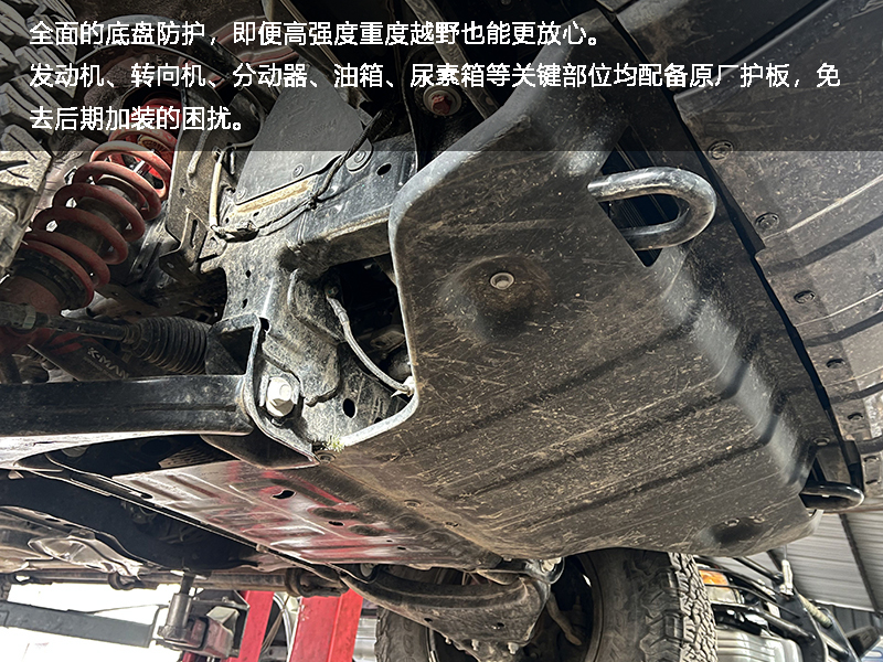 对于越野来说,由于复杂的路况环境,出现磕碰在所难免,为此江铃大道敢探者原厂配备底盘护板,为发动机、转向机、分动器、油箱和尿素箱等关键部位带来全方位保护。笔者认为,对于越野来说底盘护板是除轮胎外最重要的装备,若没有配备底盘护板,一旦出现底盘剐蹭非常危险,很容易带来高额车损费用甚至影响车内人员安全。江铃大道敢探者原厂配备全方位底盘防护,也足以体现出其对越野领域的明确洞悉。