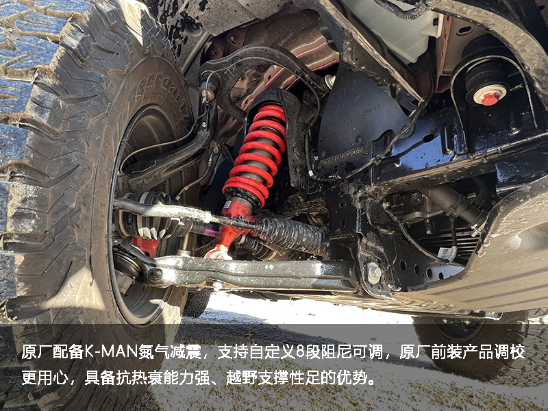长时间高强度越野,动力只能保证下线,减震器才是拉高上线的核心,尤其是氮气减震几乎是必改科目之一,全新江铃大道敢探者原厂给到大品牌K-MAN氮气减震,支持自定义8段阻尼可调,原厂前装产品调校更用心。氮气减震相比油减的优势在于抗热衰能力强、越野支撑性足,可以说是越野老炮必改,大道敢探者原厂配备,一方面体现出其在研发过程中进行了深度市场调研,了解用户真实需求。另一方面氮气减震尤其是K-MAN等大牌产品售价较高,展现出江铃皮卡为用户带来优质产品不惜更高成本。实际体验过程中,其配备的氮气减震能够拉住车身减少多余晃动,实现越野操控性与舒适度的结合。