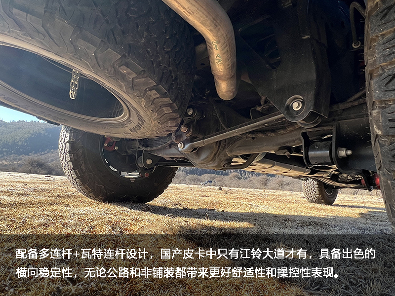 “笨重”是过去很多人对传统皮卡的第一印象,也就是开起来不灵活操控性不佳,而江铃皮卡一直以来与美系车有着千丝万缕联系,在底盘这一最需要调校经验积累的部分更是充分放大自身优势。硬件方面依旧为前双叉臂后多连杆整体桥,并且延续了国产皮卡独有专利性的瓦特连杆设计,在硬件层面上便拉开差距,具备出色的横向稳定性,无论公路和非铺装都带来更好舒适性和操控性表现,驾驶大皮卡也能带来畅快的操控体验。