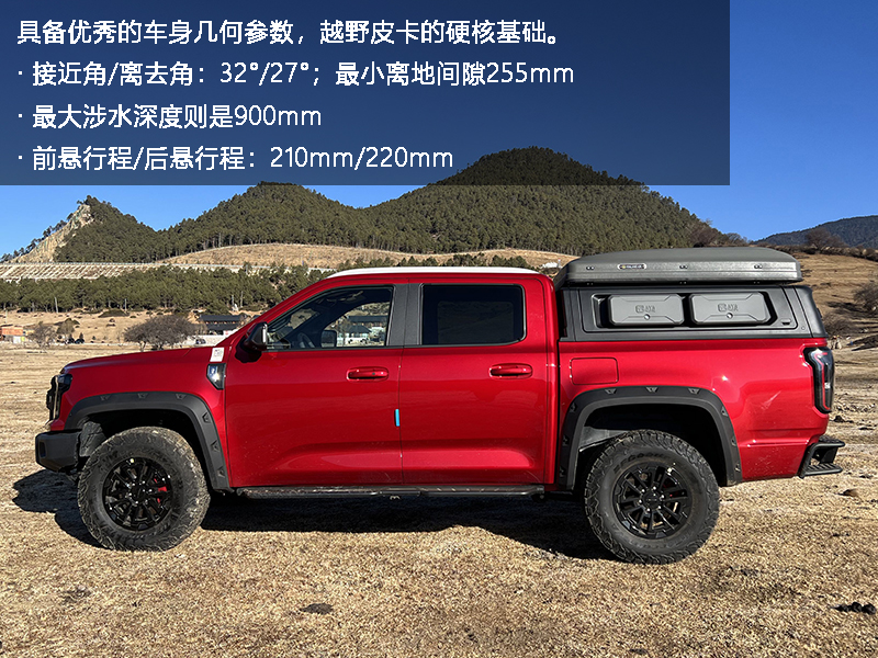 作为一款定位硬派的越野皮卡,不仅需要强劲的动力储备,越野通过能力也是保证其上限的关键考核项目之一,毕竟皮卡车型在轴距方面很难有优势,更需要车身带来更好的通过性。全新江铃大道敢探者拥有优秀的车身参数,具备32度的接近角和27度离去角,最小离地间隙也来到了255mm,最大涉水深度则是900mm,这一车身数据即使是在同级越野皮卡中也属于出类拔萃,为其奠定了强悍越野实力的硬性指标。此外,它还具备长行程悬架,前悬行程210mm,后悬行程220mm,这在通过交叉轴路况时优势明显,在一些相对较小的炮弹坑可实现车轮不离地的平稳通过,丝毫不输主流硬派越野车。