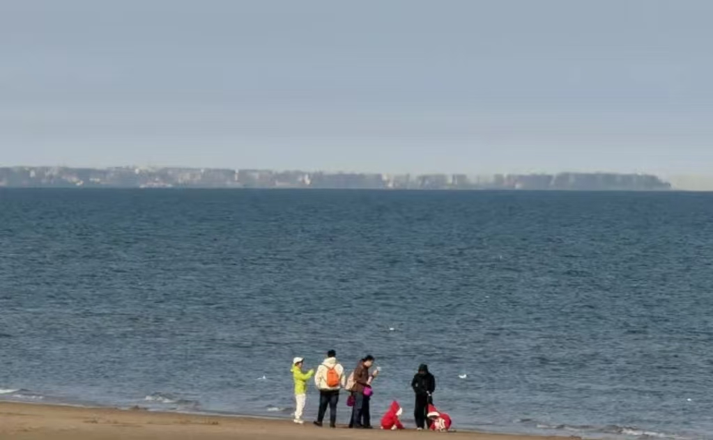 一堵墙,几十公里长,笔直。墙上有高楼、大圆柱子、五颜六色的小船在里面晃悠。当地一个30多岁的大哥说,他活这么大没见过这么齐整的海市蜃楼,电视里的都是歪七扭八的,这个“比刀切豆腐还规整”。
