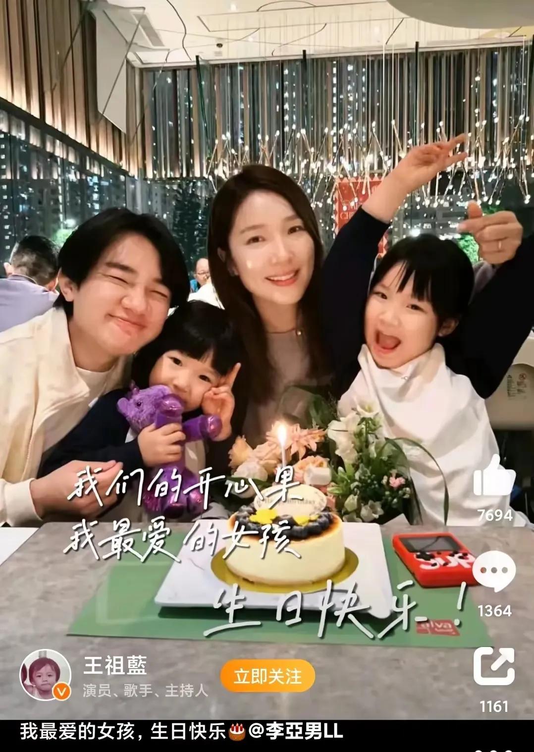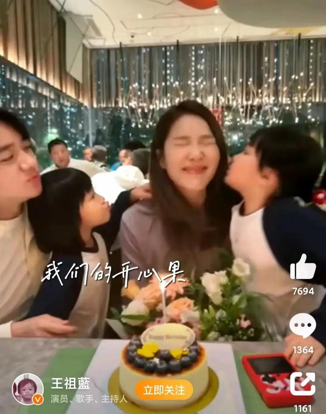 生日终于到了,王祖蓝一家四口聚在一起,带着鲜花和蛋糕,享受属于他们的幸福时刻。照片里,一家三口都追着给家里的“公主”亚男送吻,亚男笑得眼睛都快看不见了。