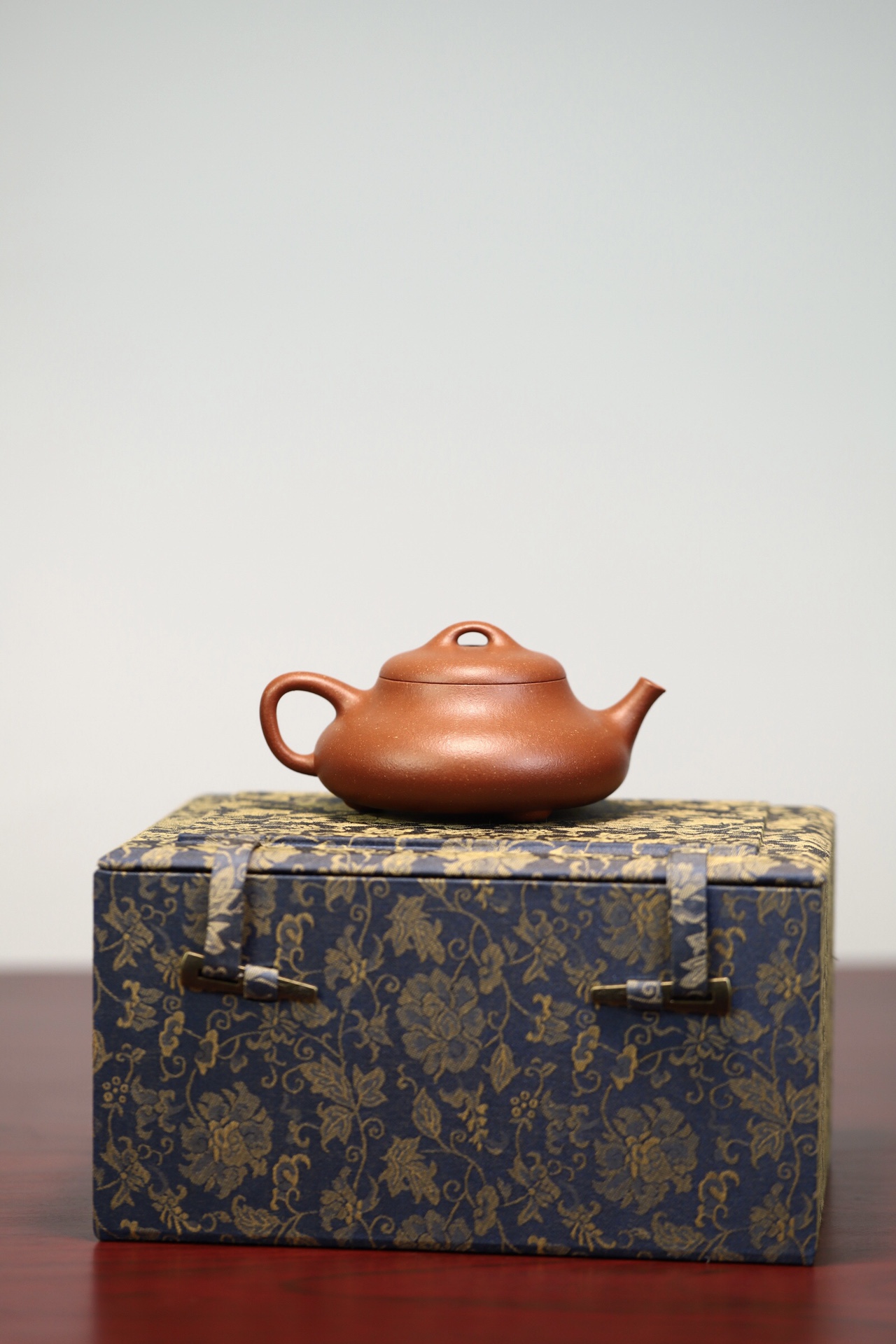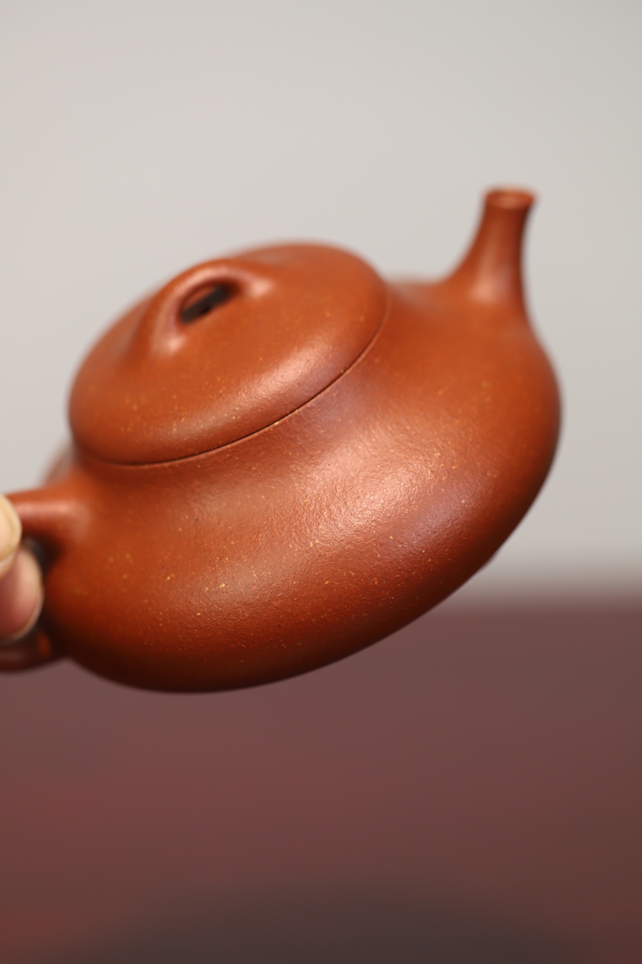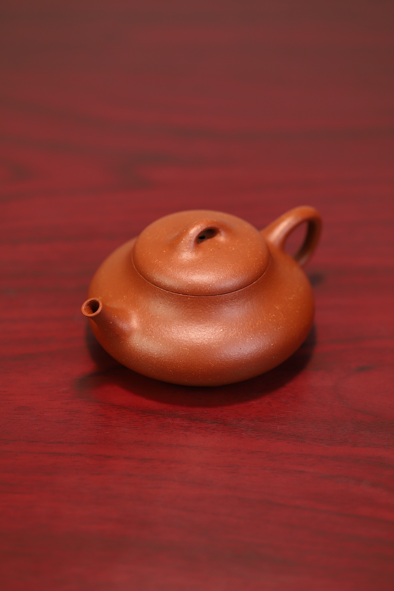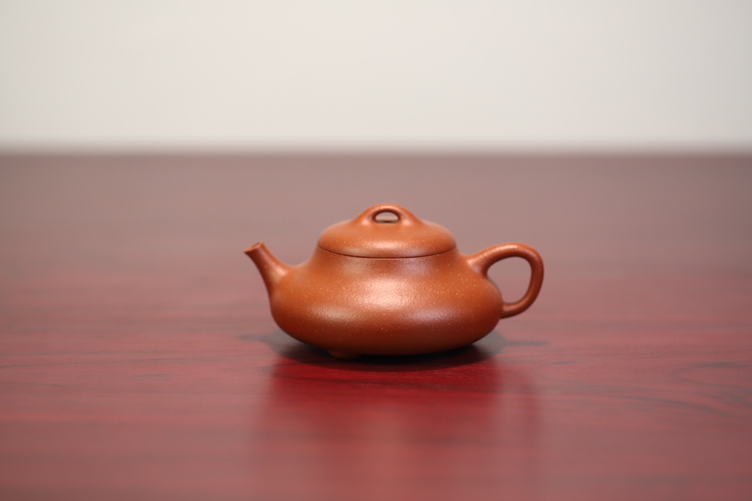 见瓢·全手工/容量175cc/极品宝山红降坡泥此壶型犹如水瓢,造型简朴大方。线条明快流畅,壶腹上小下饱。桥钮、盖面微凸,
