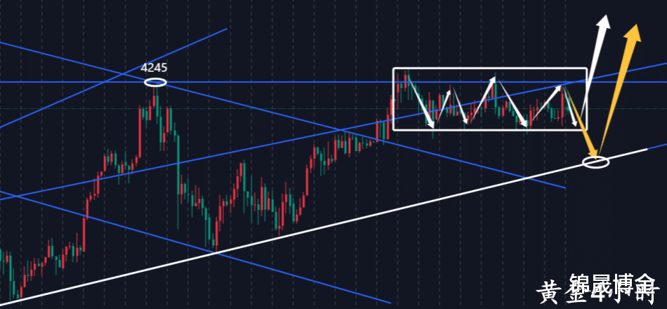我们从四小时图上来看一下,从上周一开始到今天,连续八天横盘整理,始终压制在4245这个水平压力位下方,虽然有蓄势往上走的可能,但是横盘震荡的时间过长,也要谨防上冲失败。