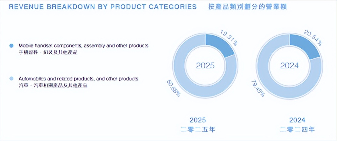 在2025年,汽车以及汽车相关的产品产生的营收占比亚迪总营收的80.68%,而手机部件及组装相关的产品产生的营收占比亚迪总营收的19.31%